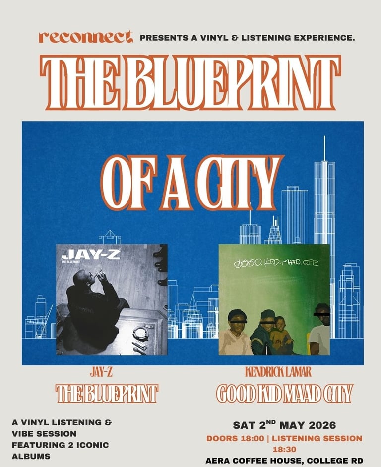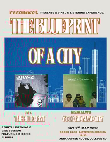 Hosted at Aera Coffee House, this evening invites you to slow down and listen deeply as Kendrick Lamar’s good kid, m.A.A.d city and JAY-Z’s The Blueprint are played in full on vinyl — side by side, front to back.